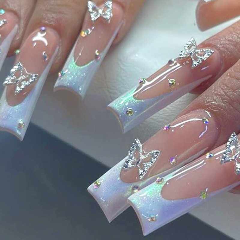 24 Pcs Long Press on Nails White French Tips Fake Nails Butterfly Rhinestone Full Cover Nails Tips Coffin False Nails with Charms Nail Decorations Glitter Acrylic Nails Glue on Nails for Women Girls