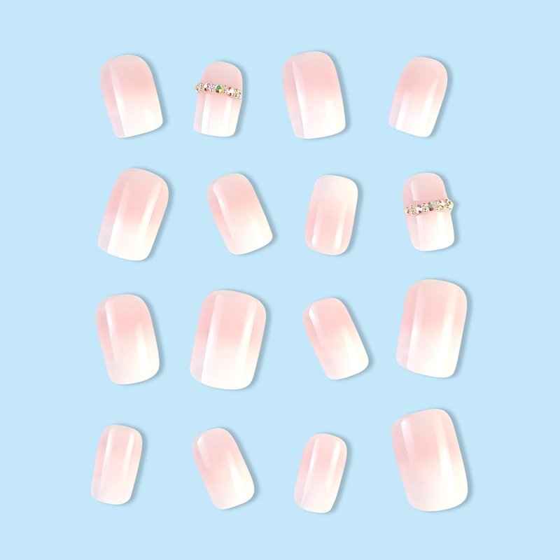 24 Pcs Medium Press on Nails Square Pink Fake Nails Gradient False Nails with Rhinestone Designs Full Cover Stick on Nails French Nails for Women and Girls Fall Nails