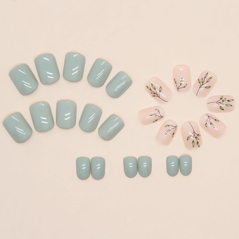 24 Pcs Press on Nails Short Square Fake Nails Elegant Lake Green False Nail Tips with Leaf Designs Glossy Nude Acrylic Nails Full Cover Glue on Nails Short Artificial Stick on Nails for Women