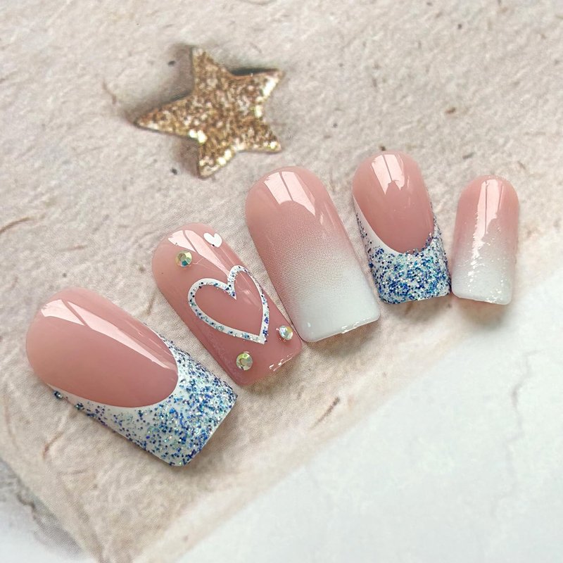 24 Pcs Spring French Tip Press on Nails Square Medium Fake Nails with Glue Glitter Love Heart False Nails Kit Full Nail Tips Reusable Stick on Nails Artificial Nails for Women Girls
