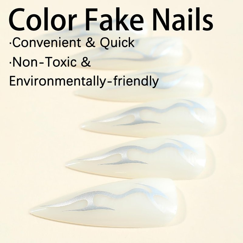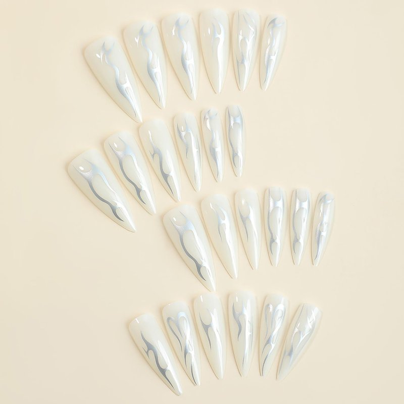 24 Pcs Stiletto Press on Nails Halloween Fake Nails White Long Nails Silver Flame Designs False Nails Glossy Full Cover Stick on Nails for Women and Girls Halloween Nails