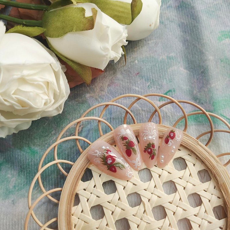 24 Pcs Stiletto Press on Nails Medium Almond Fake Nails with Glue Nude Full Cover False Nails with Pearl Strawberry Pattern Designs Glossy Stick Acrylic False Nail Kit Cute Glue on Nails for Women