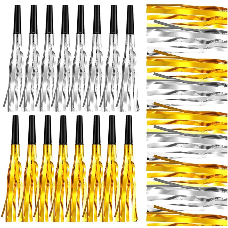 The package includes 24 glittery metallic fringed noise makers, with 12 gold and 12 silver ones. These classic colours are great for decorating all kinds of parties.