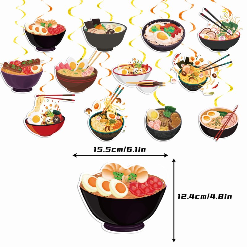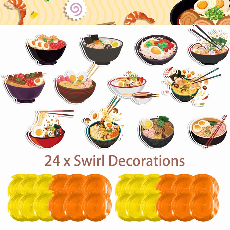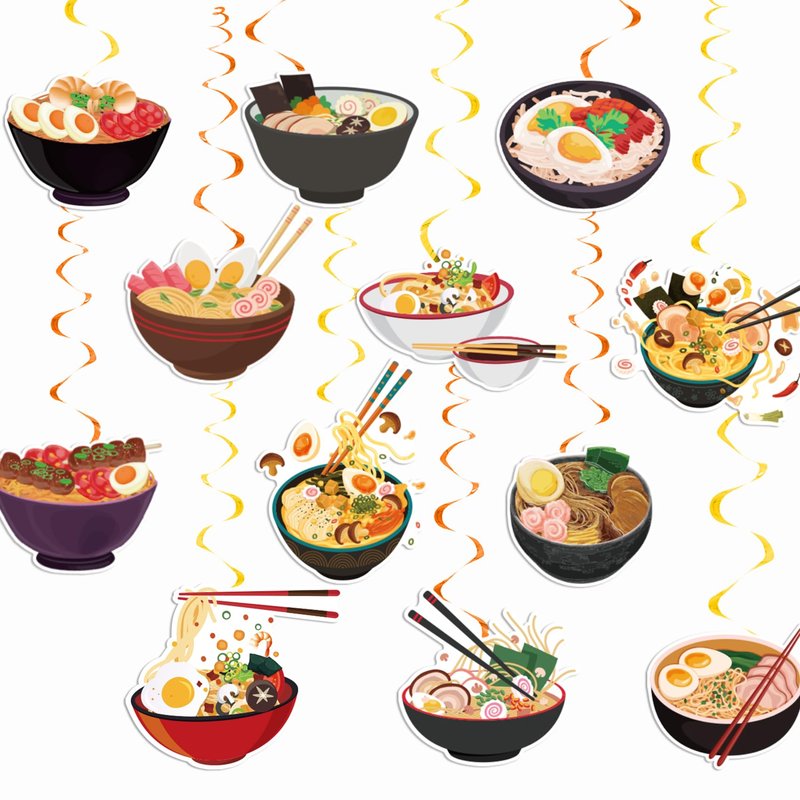- Ramen Noodles Party Supplies: Package includes 24* ramen hanging cards (12 different designs, each design 2 pcs), 24* spirals. Perfect decoration for ramen noodles themed parties.