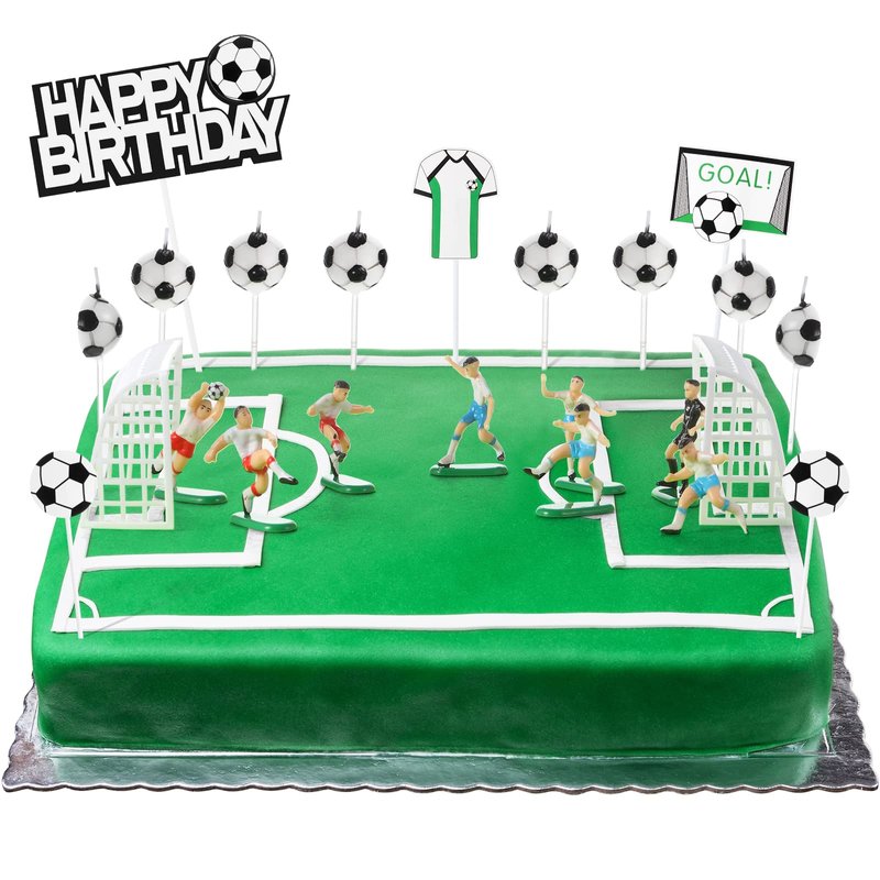 - Soccer Cake Decoration Set: you will receive 1 set of soccer cake decoration, including 6 players toppers, 1 soccer ball and 2 goal cake toppers; 4 soccer themed inserts and 1 [HAPPY BIRTHDAY ] cake toppers and 10 football birthday candles, enough quantity for you to use and replace