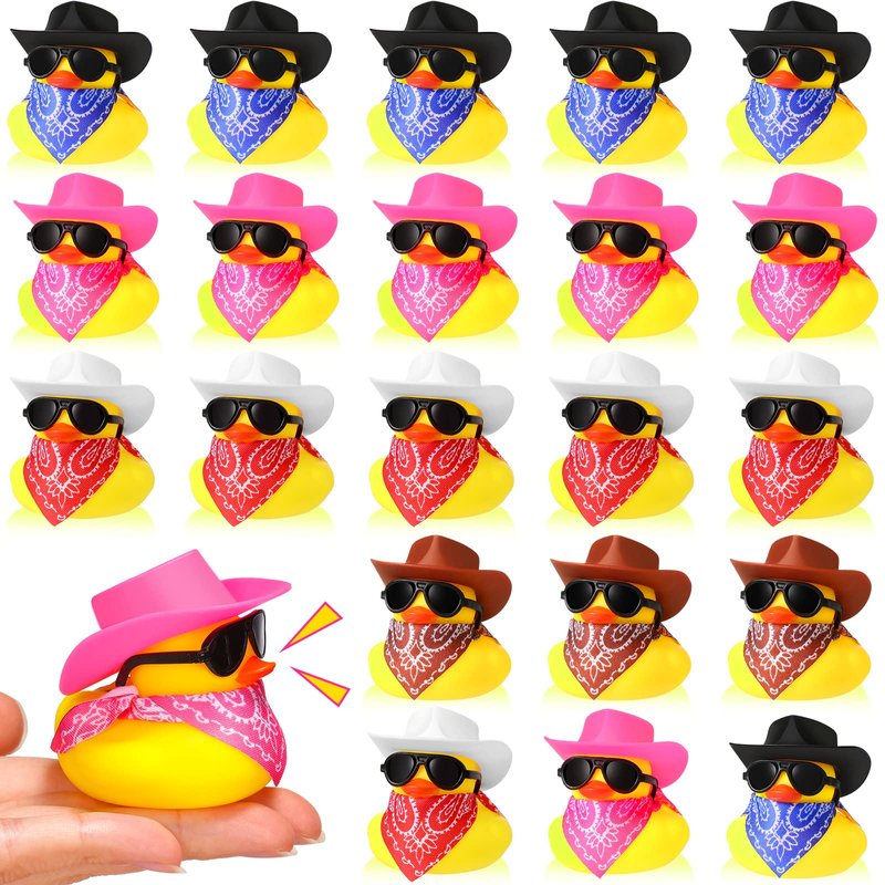 24 Set Cowboy Rubber Duck Mini Yellow Duckies Bath Party Toy Tiny Ducks Bathtub Toy with Cowboy Hat Paisley Bandanas Sunglasses for Summer Baby Shower Birthday Swimming Party Favor (Cute Style)