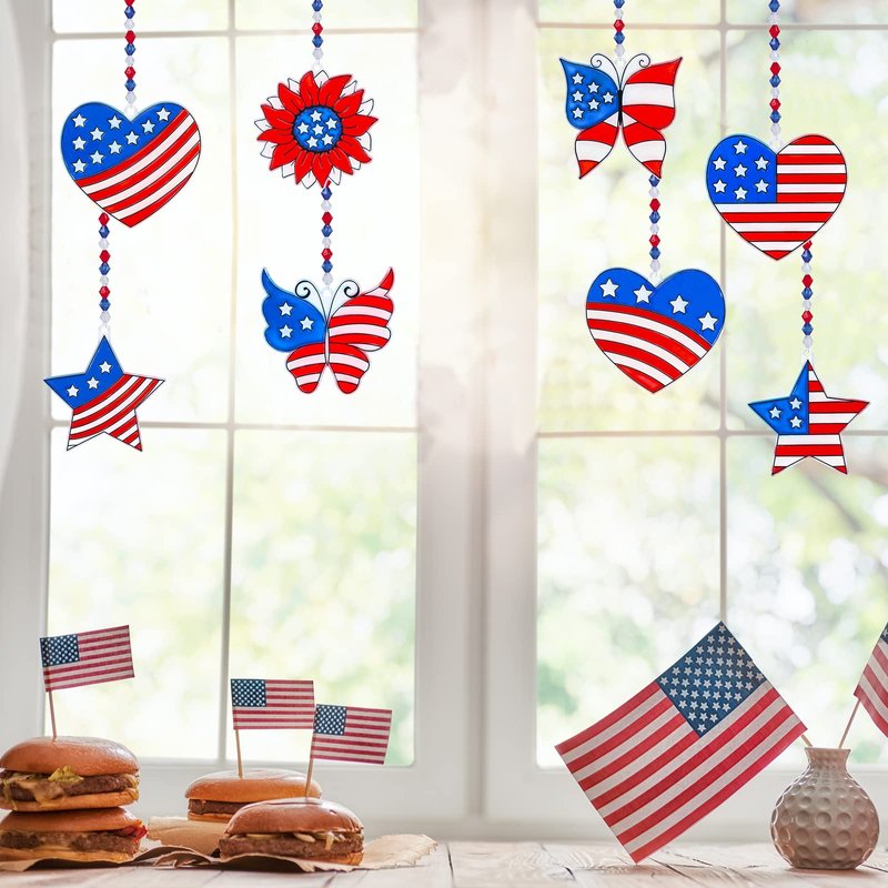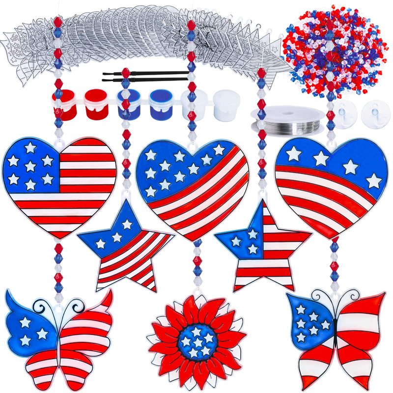 - Quantity: 24 Sets Patriotic Suncatcher Ornaments Craft Kit includes 24 pcs assorted suncatchers in 8 American flag inspired designs, each design has 3 pcs, 288 pcs acrylic beads in red, clear, and blue, 1 set of acrylic paints in red, white, and blue, 2 pcs paint brushes, 1 roll of fishing thread, and 24 pcs suction hooks. Each suncatcher has a hole at the top for easy hanging. Add this simple-to-do craft kit to your patriotic art supplies for a fun activity for your kids.