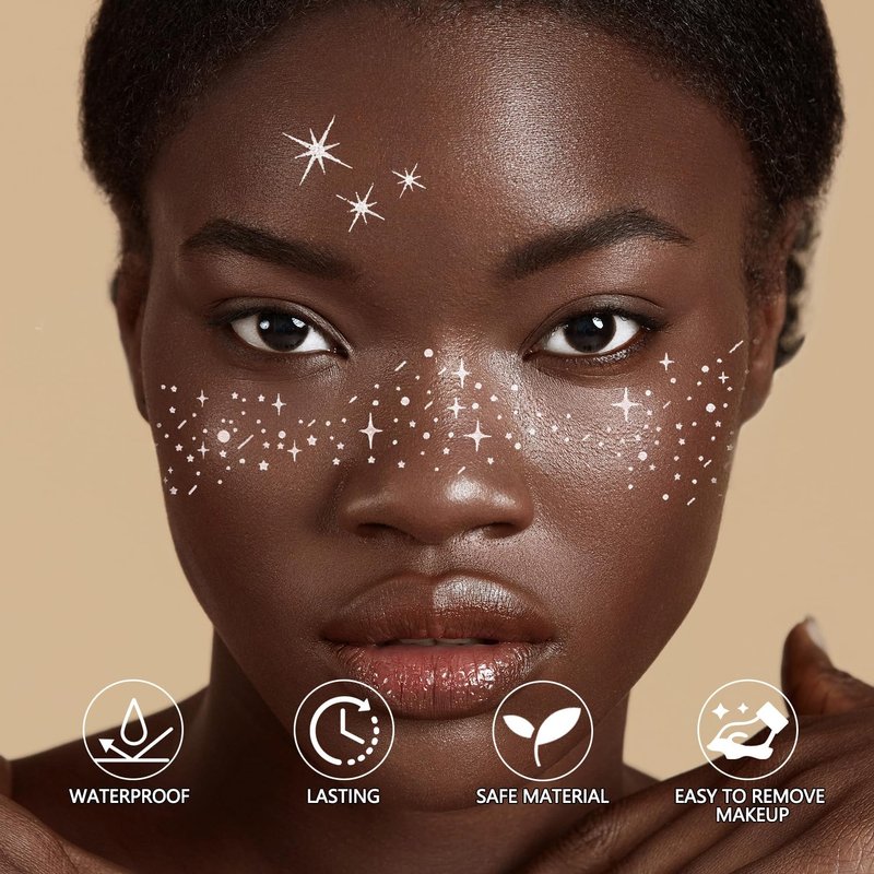 - 𝗘𝘅𝗰𝗲𝗹𝗹𝗲𝗻𝘁 𝗤𝘂𝗮𝗹𝗶𝘁𝘆: Glitter freckles face tattoo are made with attention to detail and quality.Face temporary tattoo made of high quality materials, no smell, safe and non-toxic, please rest assured that it can be used on skin. Our temporary face tattoos ensure they stay put all day without fading, providing a long-lasting sparkle that shines through any occasion.