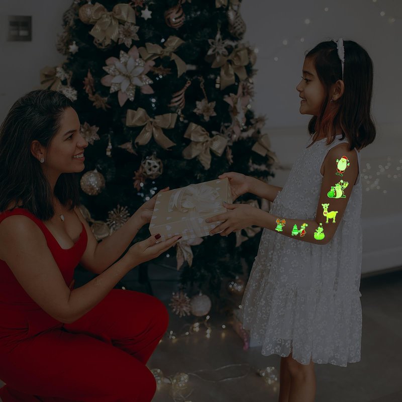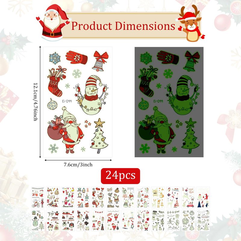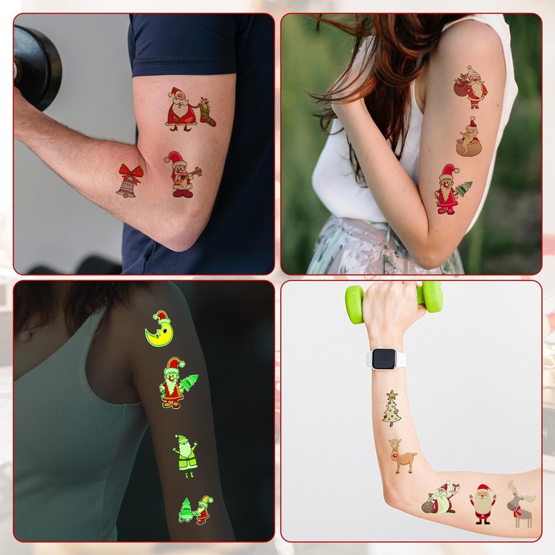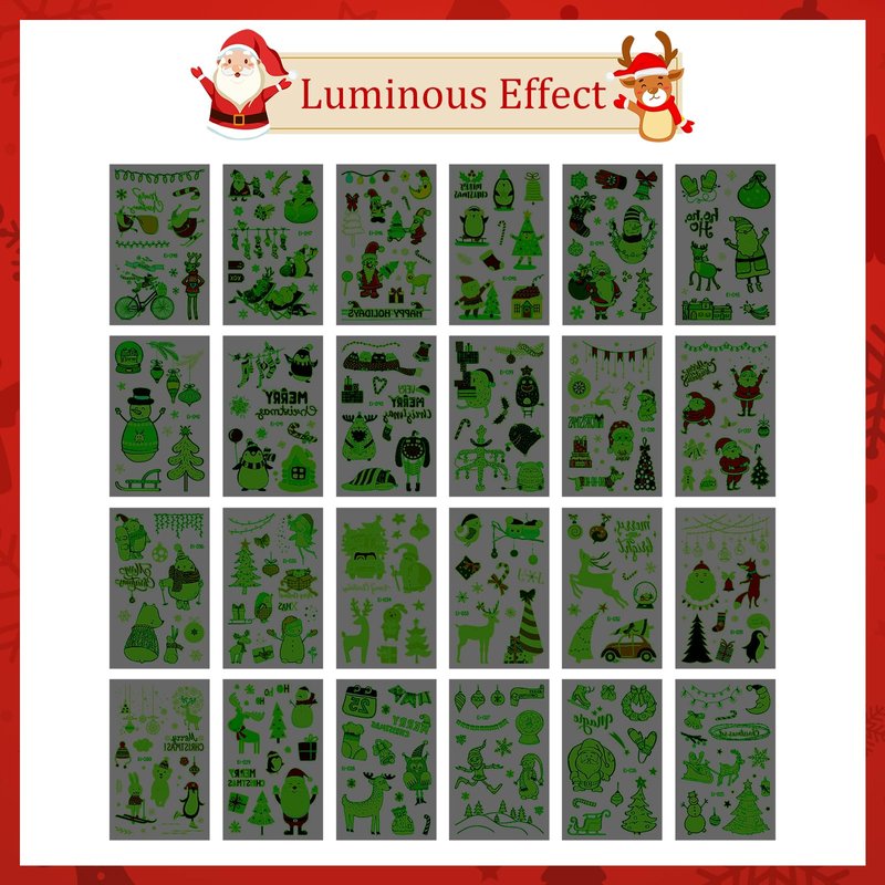 - Luminous: The Xmas temporary tattoo will glow in the dark, making you more attractive at night. Please note the glow effect needs to absorb the light source under the strong light or ultraviolet, the glow time is related to the light time and intensity. If it is not absorbed for a long time, it will gradually weaken.
