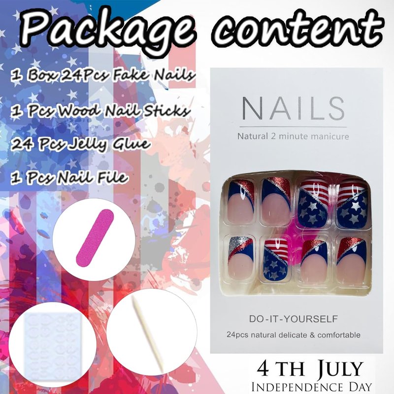 - 【Independence Day Press on Nails Set】You will get 12 different sizes 4th of July fake nails art 24pcs set, 24 pieces adhesive nail jelly stickers, mini nail file wooden stick and alcohol pads. No need to buy other things, you can get the nail salon-like effect.