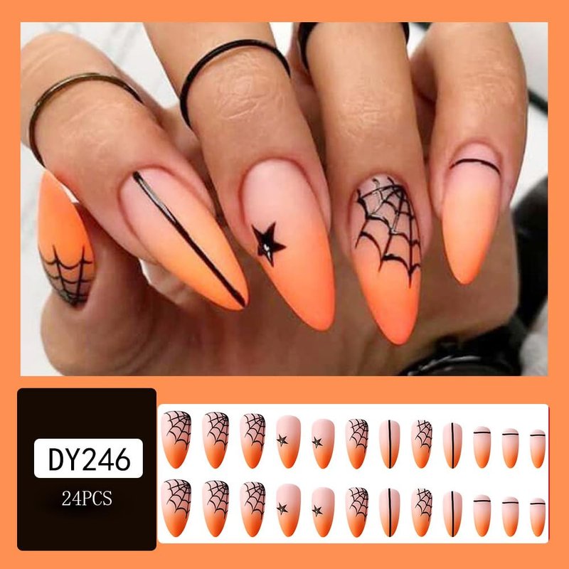 24Pcs Almond Halloween Press on Nails Medium Fake Nails Glossy Orange Halloween Acrylic Nails Full Cover Spider Web Glue on Halloween Nails Medium Stick on Nails for Women Halloween Day Manicure
