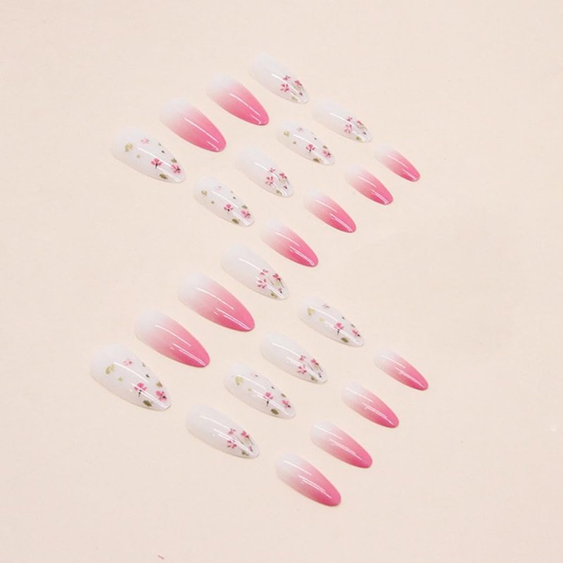 24Pcs Almond Press on Nails Medium Cute Flowers Fake Nails Spring Pink Gradient False Nails Glossy Full Cover Acrylic Nails Reusable Natural Stick on Nails with Glue for Women DIY Manicure Decoration