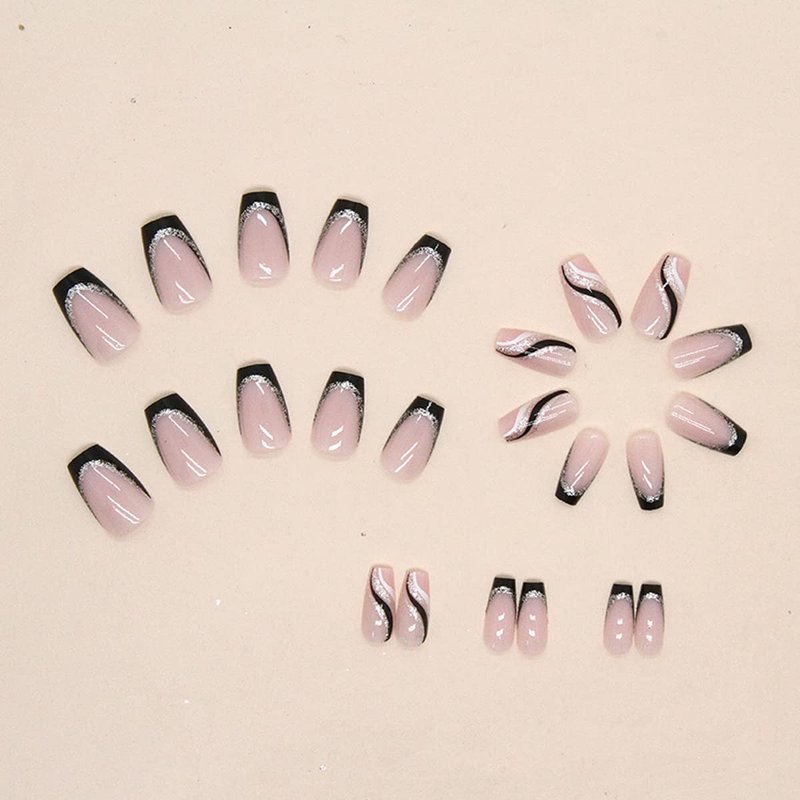 24PCS Black French Tip Press on Nails Medium Length Square Fake Nails with Silver Glitter Line Designs Glossy Coffin Nails Full Cover Nail Tips Glue on Nails Artificial Acrylic False Nails for Women
