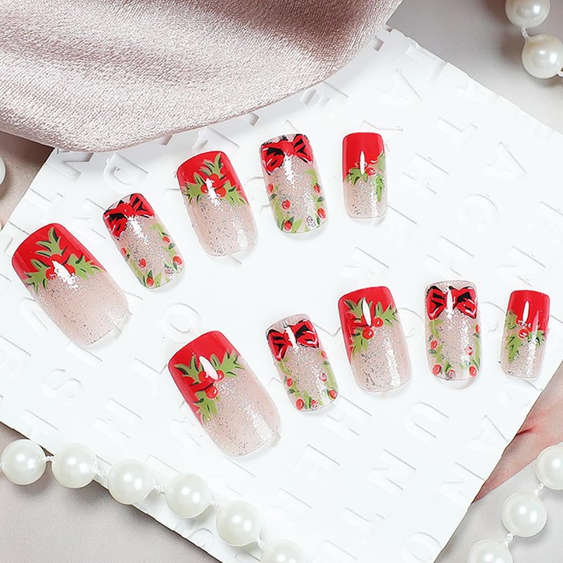 - Easy to Apply: Full cover nails with Christmas holly leaves design set are instead of spend lots time and money at nail salon, you can change you nails style in anytime and anywhere. The pink fake nails will stay longer if you clean your nails before use, and avoid water within the first hour of wearing.