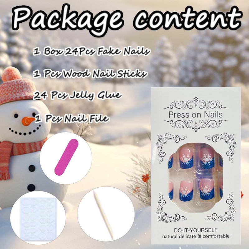 - Christmas False Nails Kit: You will get a box of 24 pcs Christmas short square press on nails, 24 pcs adhesive nail jelly stickers, 1pcs mini nail file, 1pcs wooden stick. No need to buy other things, you can get the nail salon-like effect