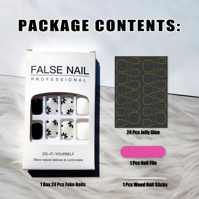 - Package Contents: 24 Pcs flowers fake nails and jelly glue stickers.(Jelly glue doesn't last as long as liquid glue, but it has the advantage of making the fake nail reusable. So I suggest please use suitable glue according to different scenarios)