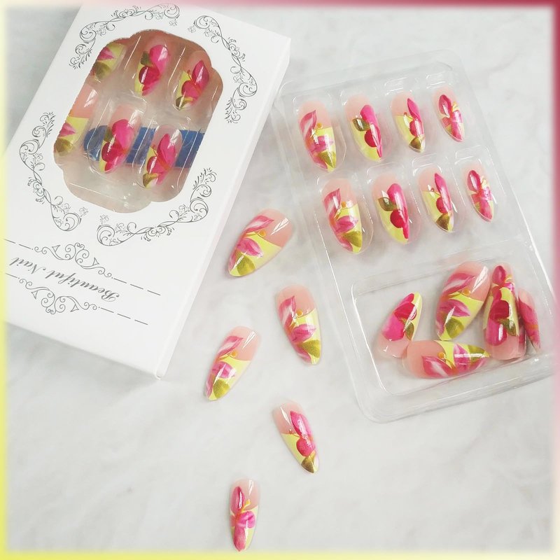 - 【Tropical Flower Fake Nails Package Contains】 24 Pcs cute false nails, 24 pieces of jelly glue, 1 mini nail file, 1 wooden stick. (Durability of jelly glue is not as good as liquid glue, but it makes fake nails reusable. Jelly glue can last about 3 days or more, glue remains longer.Please use your suitable glue according to different scenes)