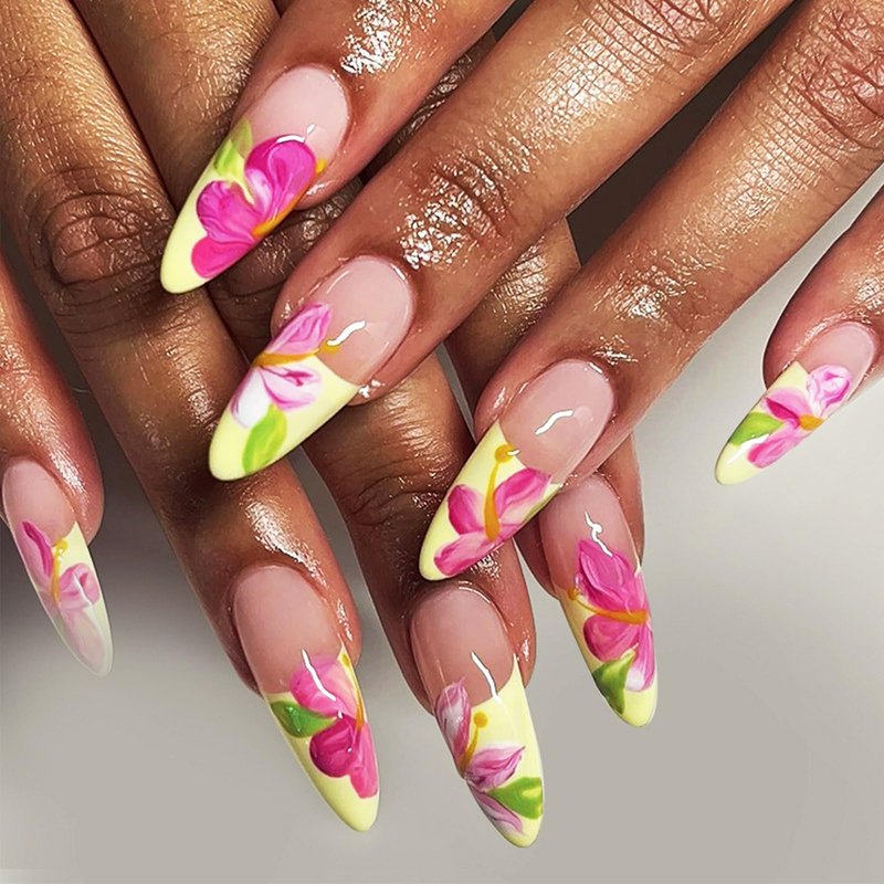24Pcs Medium Length Summer Spring Tropical Flower Press on Nails, Acrylic Glue on Nails for Coquette Women Girls, Glossy Light Yellow French Tips Fake Nails with Exquisite Designs