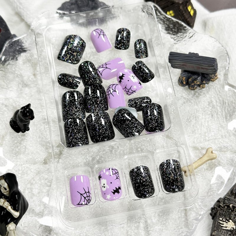 - 💅🏻Halloween Nails Art Design- Halloween purple press on nails short with spider web, bat, ghost designs, full of halloween elements, will make your fingers more unique and shiny, express your nail charm. Making your halloween holiday more interesting!