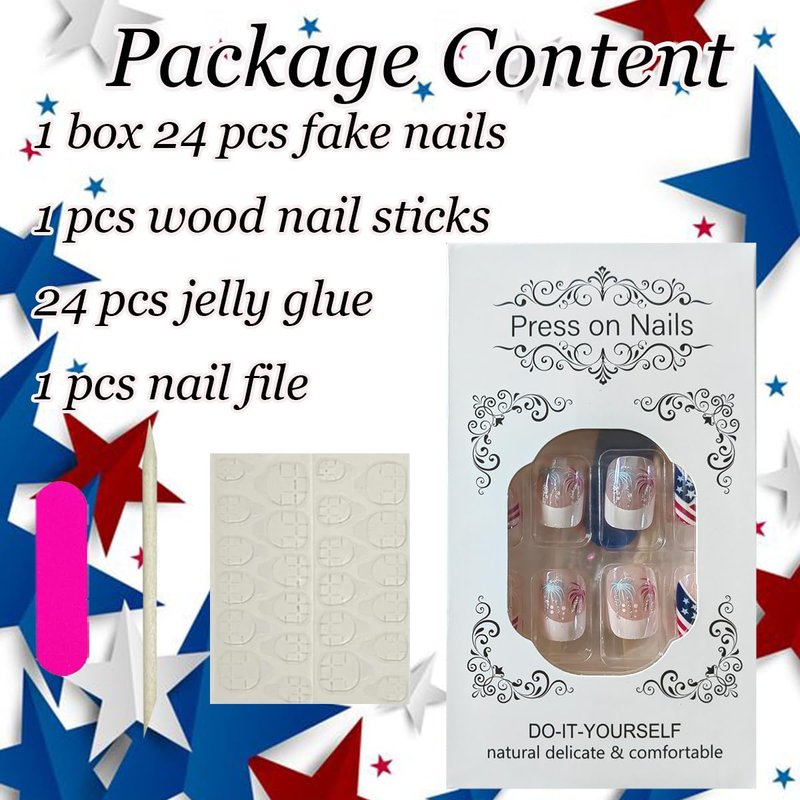 - 【Independence Day Nails Set Package Contents】24 Pcs Independence Day Press on Nails Short+1 Nail File + 24 Pcs Jelly Glue Stickers+1 Wooden Stick.(Durability of jelly glue is not as good as liquid glue, but it makes french tip fake nails reusable. Please use suitable glue according to different scenes)