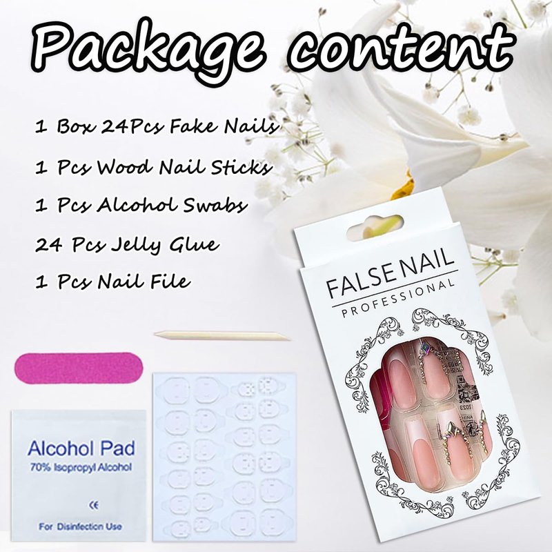 - Package: You will get 12 different sizes french tip press on nails art, 24 pcs set, including a nail file, 24 pieces of jelly glue and a nail remover bar. This product does not carry glue due to transportation. (Jelly glue is only suitable for temporary use. It is recommended to purchase professional glue for false nails.)