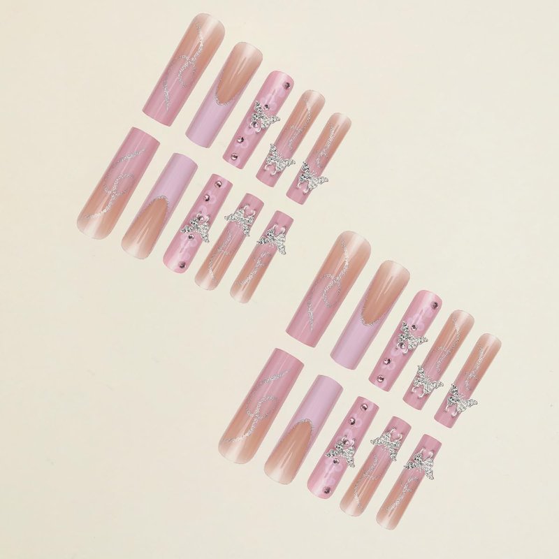 24Pcs Long Square Press on Nails Pink French Tip Fake Nails Silver Glitter with Flower Full Cover Tips Glue on Nails Artificial Acrylic False Nails Butterfly Charms Design for Women Nails Decorations