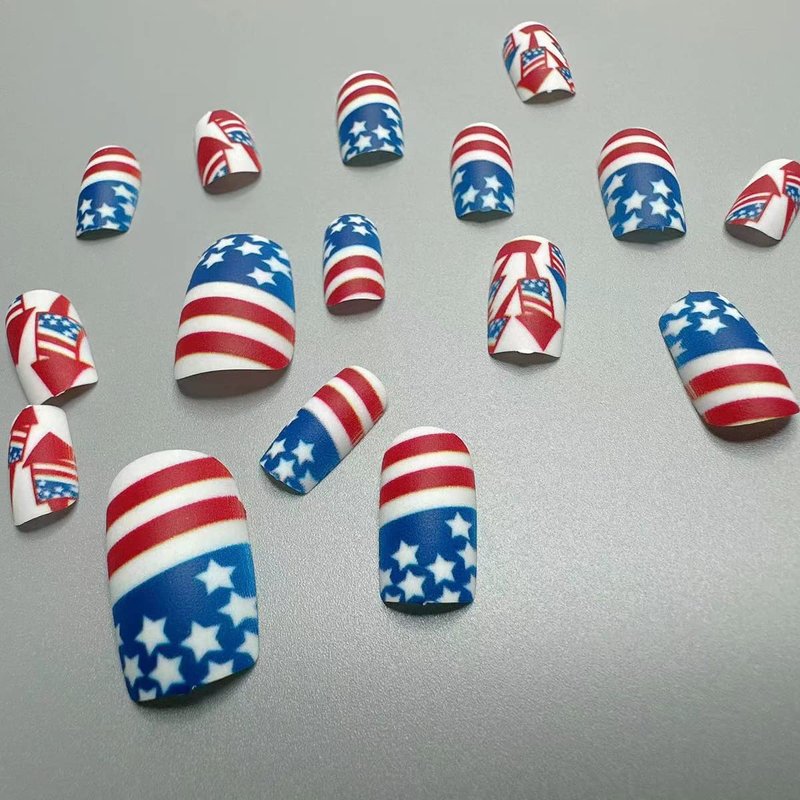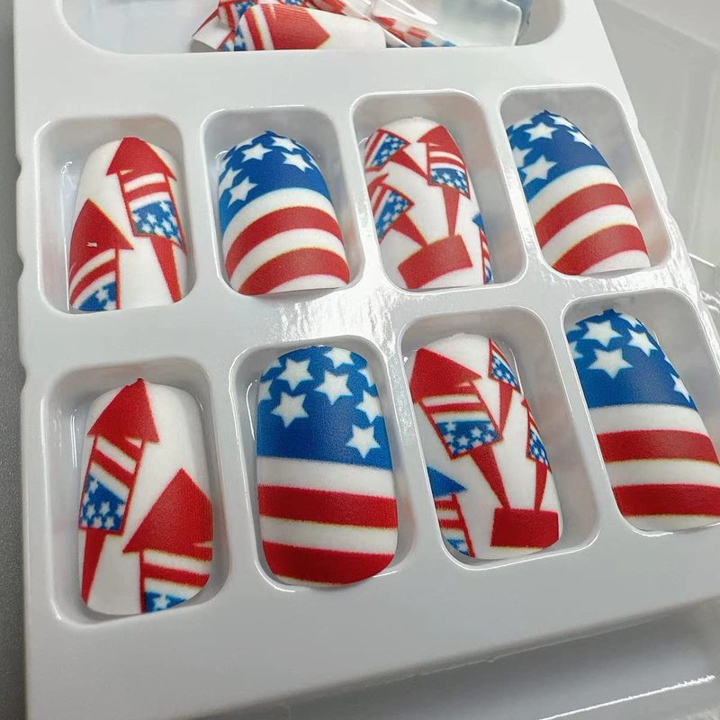 - Package :24 Pcs Independence Day Press on Nails Medium Long +1 Nail File + 24 Pcs Jelly Glue Stickers+1 alcohol cotton+1 wooden stick.(Durability of jelly glue is not as good as liquid glue, but it makes fake nails reusable. Please use suitable glue according to different scenes)