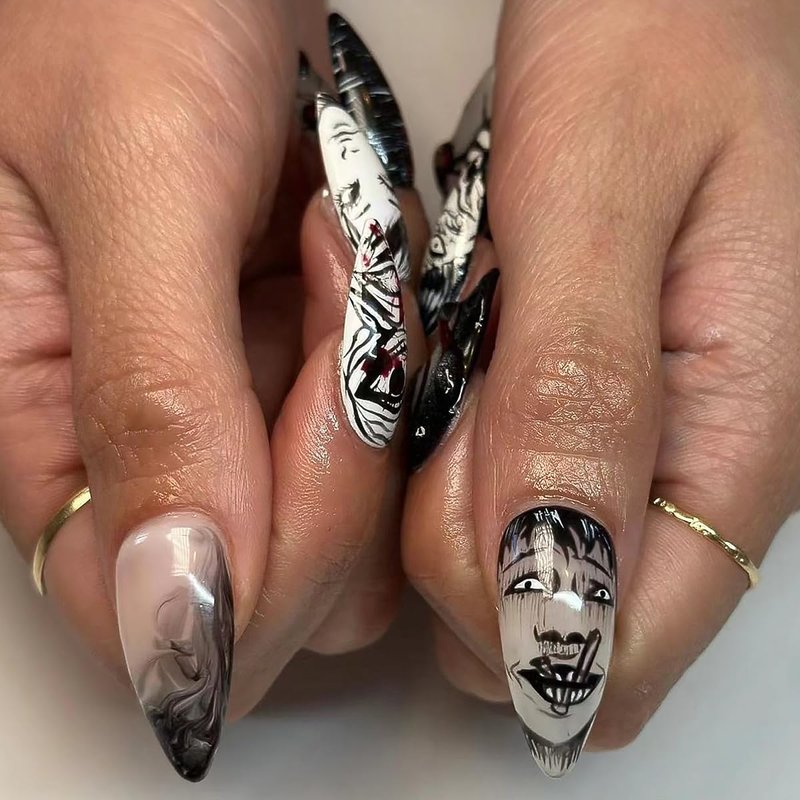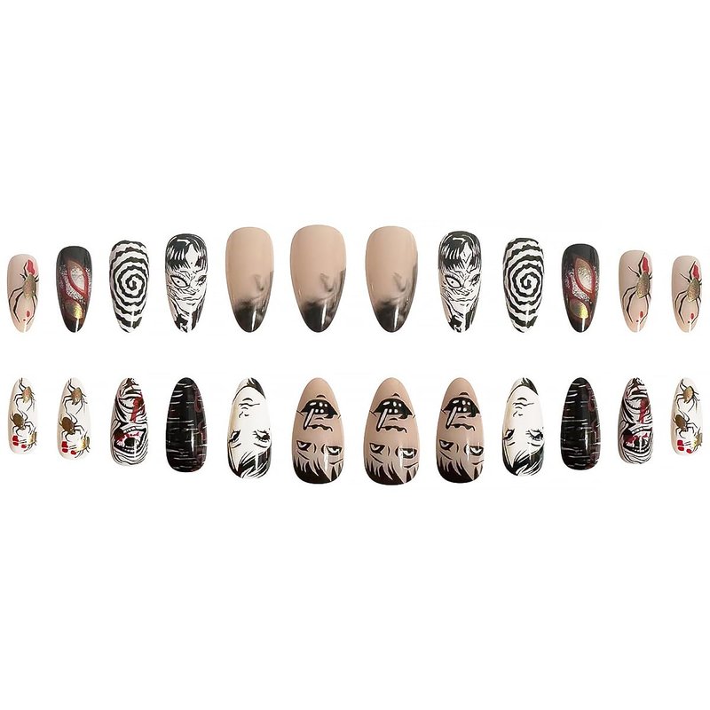 24Pcs Medium Press on Nails Almond Fake Nails Punk Cartoon Anime Design Black White Full Cover Acrylic False Nails Glue on Nails Gothic Glossy Reusable Design Acrylic Nails for Women Manicure Tips