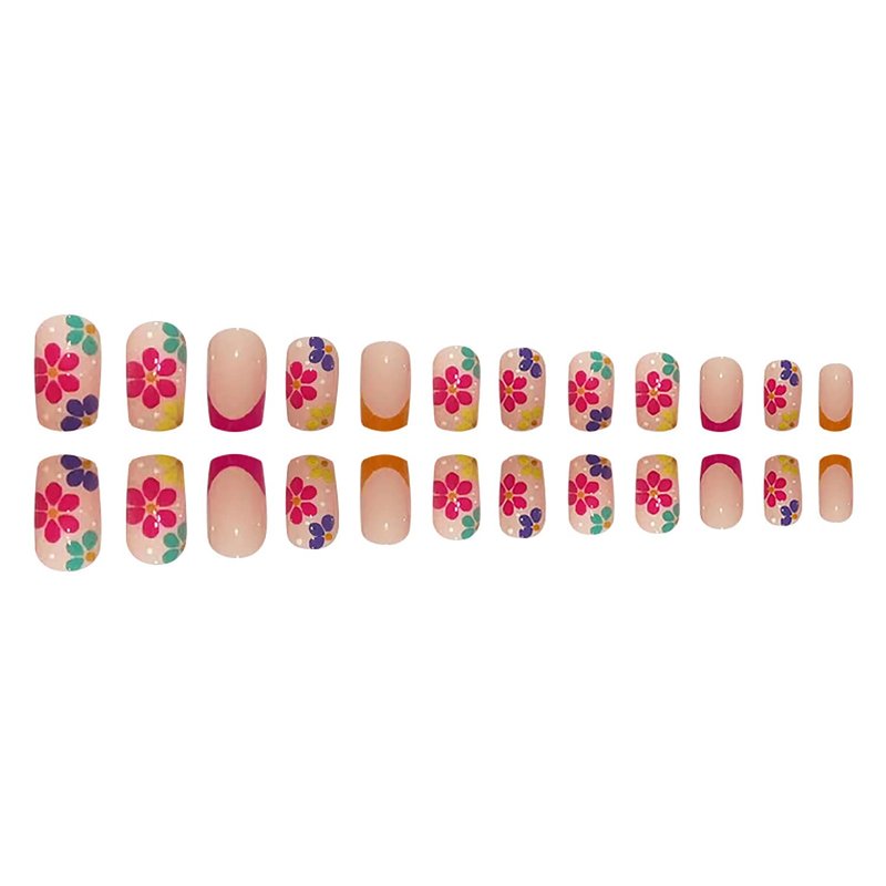 24Pcs Press on Nails Short French Fake Nails Acrylic Square Nude Pink False Nails with Flower Designs Full Cover Stick on Nails Glue on Nails for Women and Girls