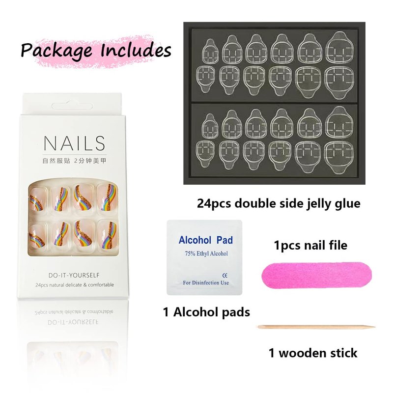 Quantity: 24Pcs/box false nail tips + press jelly glue + 1pcs nail file + 1pcs wooden stick
