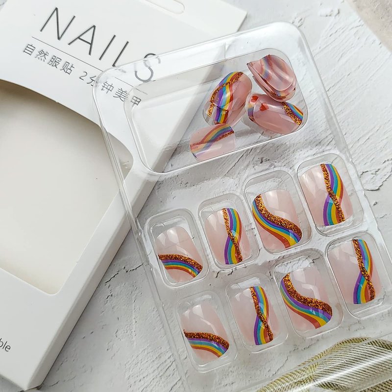 Product style:Short foundation gold glitter rainbow colorful striped heart press on nail set (24 pieces/box, with jelly glue)