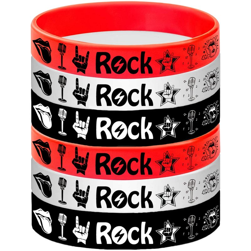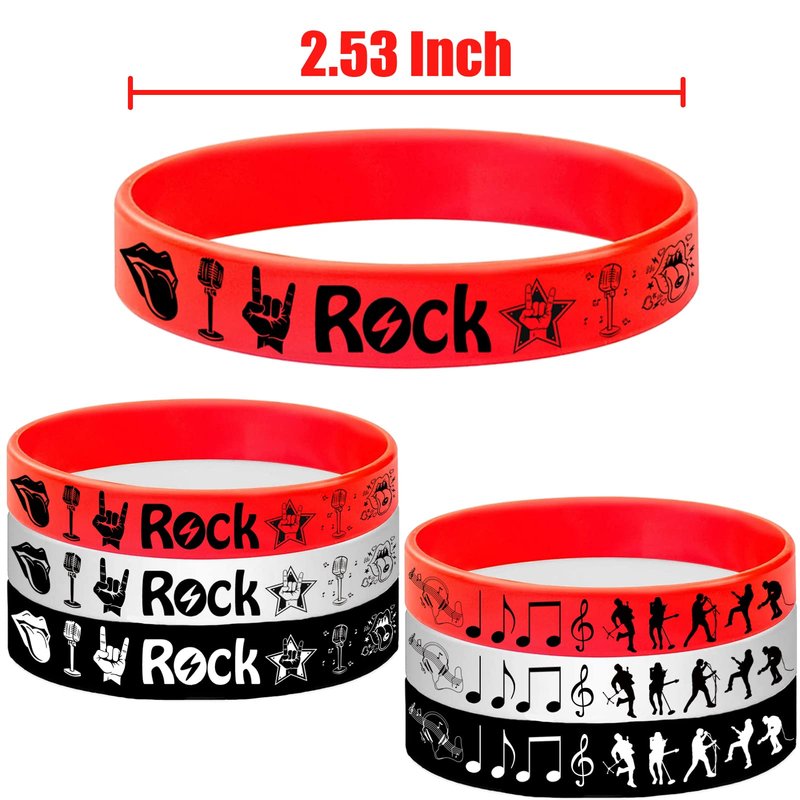 - Rock silicone bracelet set: 24pcs rock and roll themed rubber bracelets in three color styles, including black, white, red, the number of each is 8pcs, the number is sufficient to decorate the party.