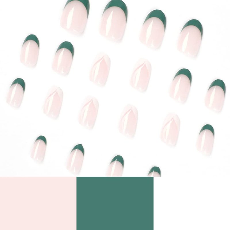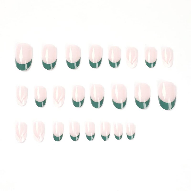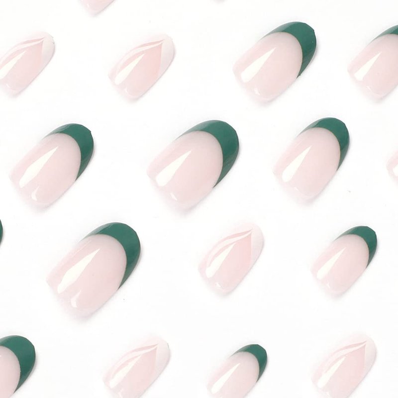 24Pcs Short Glossy Almond Press on Nails with French Green Design, Full Cover Acrylic False Nails, Nail Tips, Nail Art Kit with Glue for Women