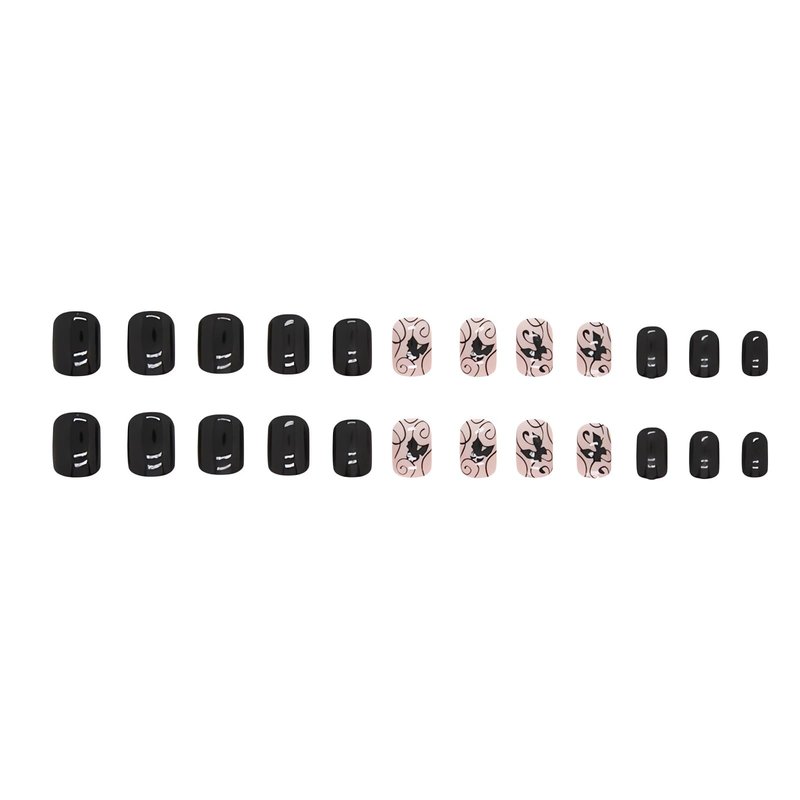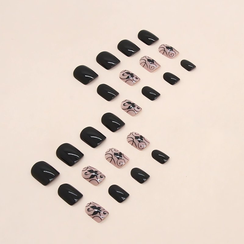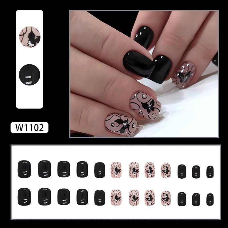 24Pcs Square Press on Nails Short Fake Nails Summer Stick on Nails Black Color False Nails with Butterfly and Vine Designs Cute Acrylic Nails Short Square Glue on Nails for Women & Girls