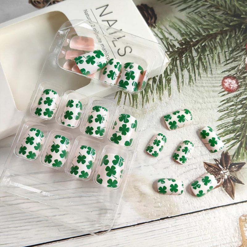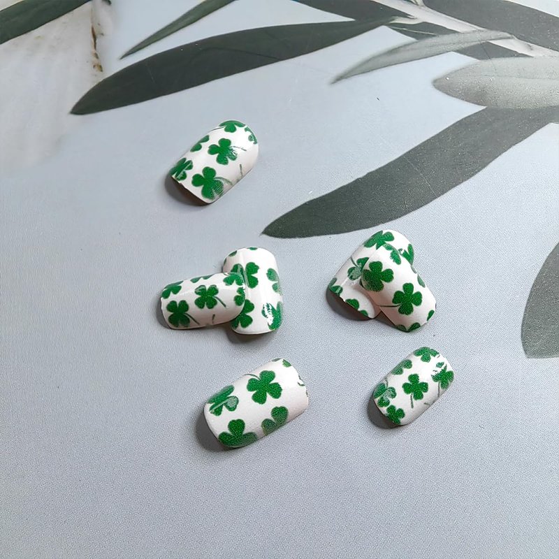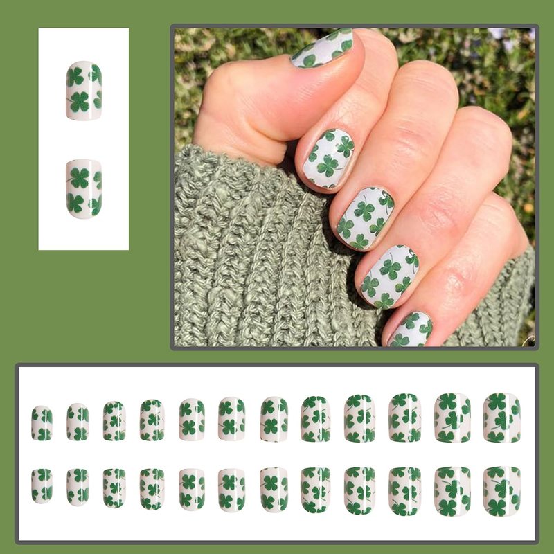 Quantity: 24 pcs lucky shamrock square short fake nails set 12 different sizes, that fits your every finger