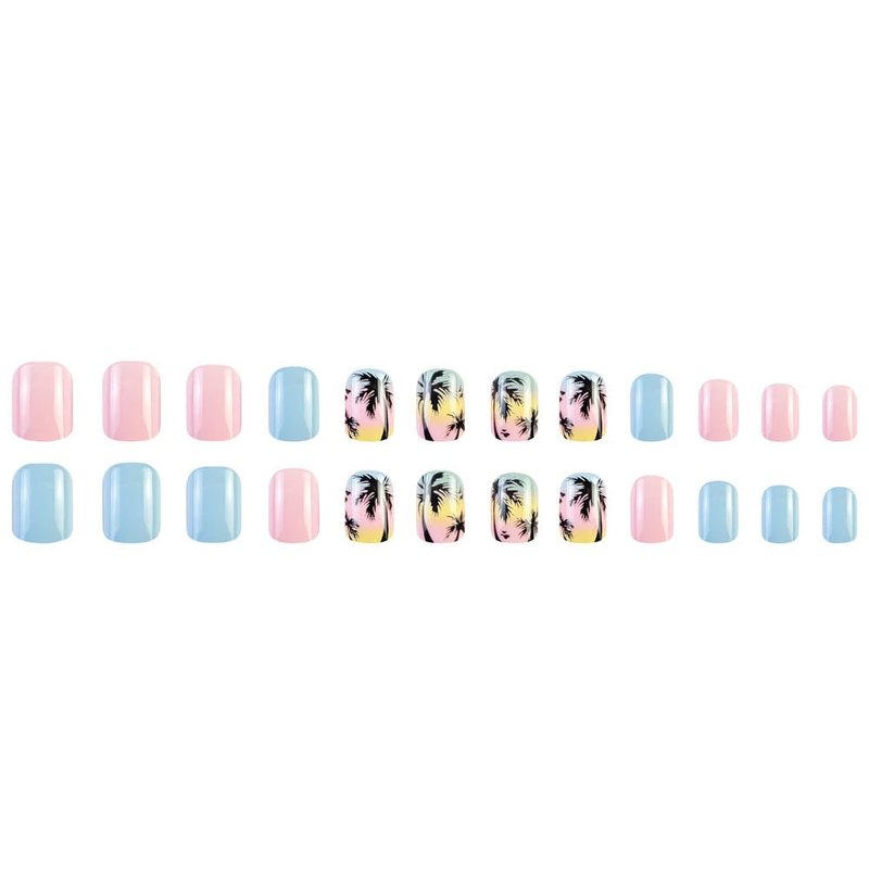 24Pcs Summer Press on Nails Square Short Fake Nails Cute Coconut Tree Stick on Nails Design Glue on Nails Full Coverage Beach Acrylic Nails Pink Blue False Nails for Women Or Girl Manicure Ornament
