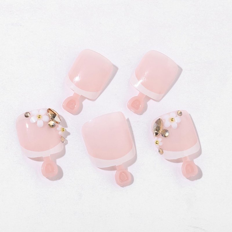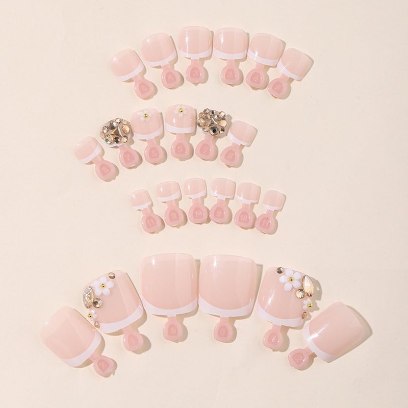 24Pcs White French Press on Toenails Short Square Fake Toe Nails Pink Toe Nail Press Ons with Flower Rhinestone Design Acrylic Full Cover Toe Nail Tips Press on Toenails for Women Manicure