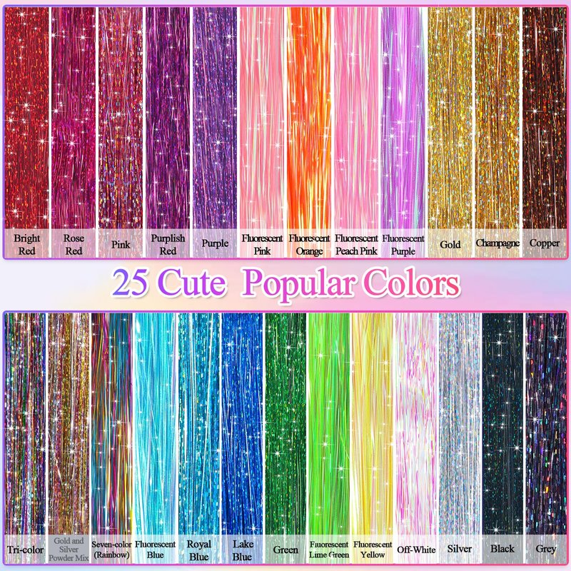 - Fairy Hair Tinsel Kit: 25 Colors 5000 strands of hair tinsel, each color Has 200 Strands, 300 pieces of Micro Silicone Link Ring Beads in 3 colors (Black, Brown, Beige), 3 sheets of Gem Sticker, 2 pieces of Black Hair Clips, 2 pieces Ponytail Hoop Tools, 1 Pack of Colorful Rubber Bands(100pcs), Tweezer, Crochet, Hair Extension Tool, Comb. That is enough to create a pretty hairstyle and make you look more charming and eye-catching.