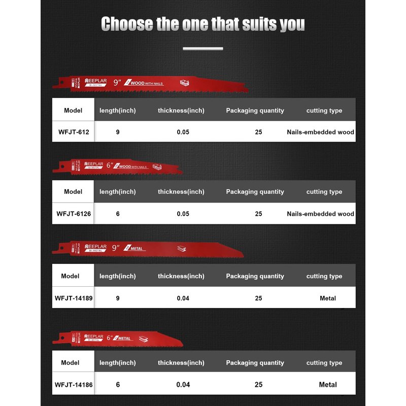 25 Pack 6 Inch 6/12 TPI sawzall blades for Wood and nail embedded wood,Bi-Metal Reciprocating Saw Blades Steel Demon Set 25pcs About Item: 6 Inch 6/12 TPI Reciprocating Saw Blades mainly used in pruning wood and nail-embedded wood, with a wide range of application value, for Nail-Embedded Wood/common lumber/Plastic/OBS plywood/nails/screws/tires/wooden fences/, etc. have very good cutting ability, long service life, save us money. Replaces: DS0612BW etc 6" 6+12TPI Reciprocating Saw Blades Compatible Reciprocating Saw models: Equipped with Universal Sabre Blade Shank, suitable for various reciprocating saws, such as DeWalt, Bosch, Makita, Black & Decker, Milwaukee, Porter Cable, Skil, Ryobi, Hitachi, Metabo and other brands of reciprocating saws. REEPLAR's reciprocating saw blade is specifically designed for maximum performance in nail embedded wood applications. These high-performance blades use bimetallic technology for longer and more durable service life, and variable tooth technology provides faster cutting speed and less vibration, making our work easier Specific specifications: Total length: 6 inches Blade thickness:0.05inch(1.27mm) TPI:6/12 Blade Material:BI-METAL Teeth Geometry: Ground sharp teeth Efficiency Easily handle various complex objects Economic 25 pieces per package and affordable Durable High grade BI-METAL material and shapeteeth giving extra durble
