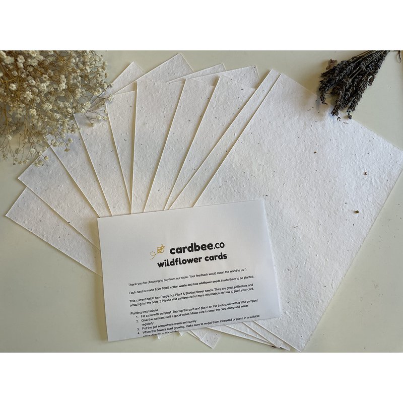 Beautiful bee friendly seeded wildflower cards for home printed greeting cards, invites and other craft projects. The card is recycled and made from cotton waste and contains wildflower seeds inside of the card Size: A5 148 x 210mm A4 210 x 297 mm GSM: 220-250 How to Print? Our seeded cards are premium quality and slightly thicker than most but should print on most inkjet printers. Please check if your printer can print on 270gsm card stock Seeds? Our seeded paper comes with high quality wildflower seeds that will be pollinators so are good for bees. How to plant? PLANT - Tear up the card and put in a pot with soil/compost WATER - Water and keep moist. Make sure the card does not dry out SUN - Put the pot somewhere warm with sunlight GROW - Re-pot or plant directly in garden when seeds have started sprouting allowing for the flowers to grow *Please only plant in your household as eco systems can be fragile*