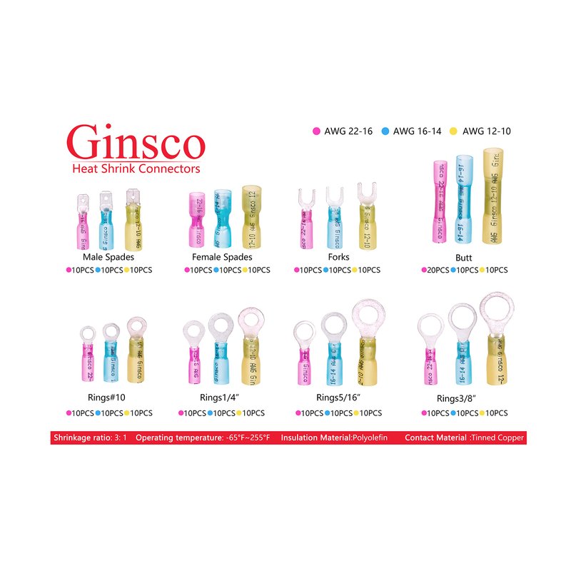 - Gauge sizes run from 22 gauge to 10 gauge with the heat shrink connectors color following the industry standard wire range.