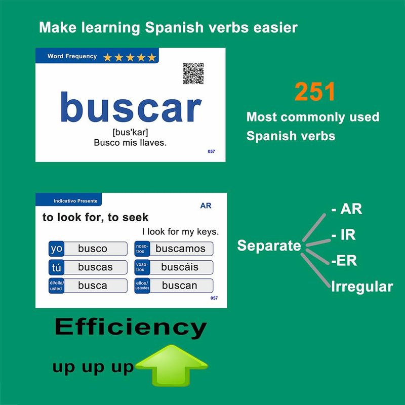 - [Efficient learning of verb conjugations]: This set of Spanish flashcards, including verb charts, offers a rich variety of verb conjugation content. You can easily identify and separate verbs you are already familiar with from irregular verbs, -AR, -ER, -IR verbs, and more, allowing for a more systematic and efficient learning experience.