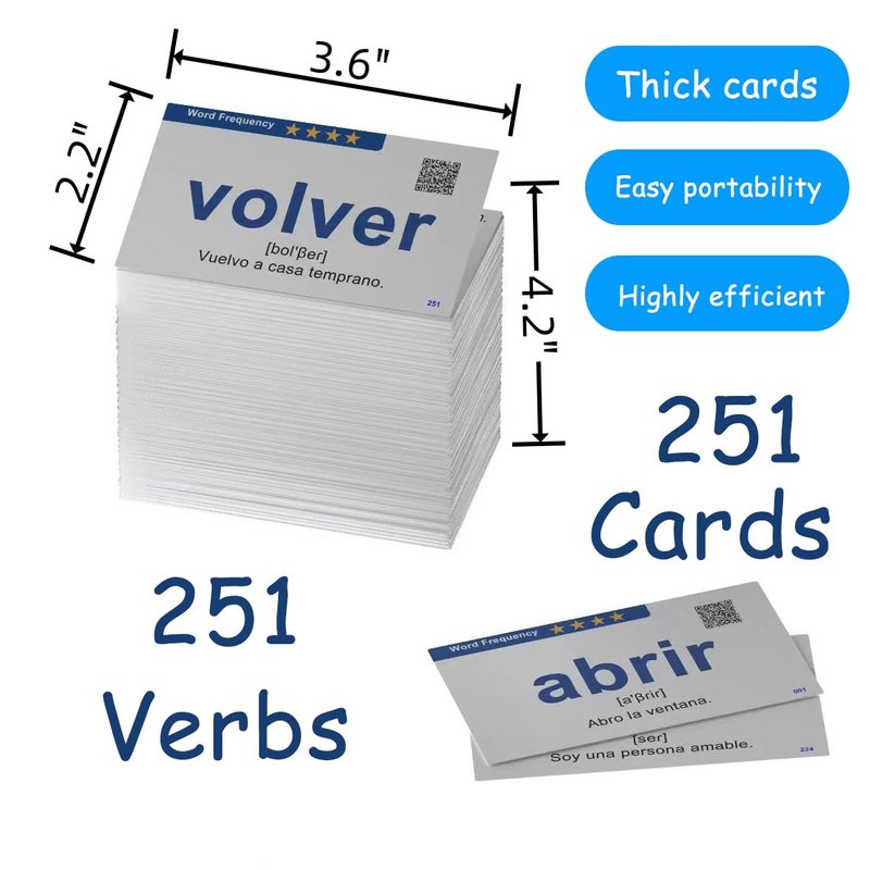 - [High-quality Spanish flash cards suitable for beginners to intermediate learners]: This set of 251 Spanish verb flash cards, including verb charts, is highly suitable for adults learning Spanish. Whether you're waiting somewhere or in any other situation where you expect to have some free time, you can conveniently carry a stack of flashcards with you for enhanced practice and review.