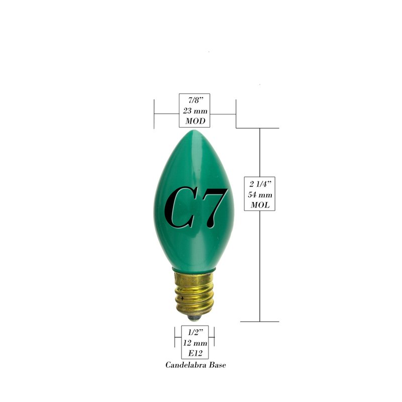 Our C7 shaped light bulbs are available in all standard colors and feature a ceramic paint that is guaranteed to last the life of the bulb. These 7 watt, 130 volt bulbs have an hour life of 4000 hours. They are safe for both indoor and outdoor use allowing you decorate both the house and tree for Christmas! Each of these bulbs measures 7/8" wide, 2 1/4" tall and features a brass candelabra (E12) base.