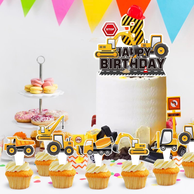 25pcs Construction 3rd Birthday Party Supplies, Dump Truck Excavator Crane Cupcake Toppers Decoration, Construction Theme Happy Birthday Cupcake Toppers Baby Shower Kids Boy Decorations (3rd)