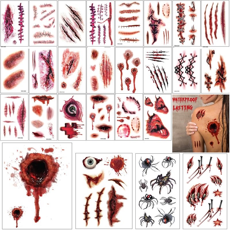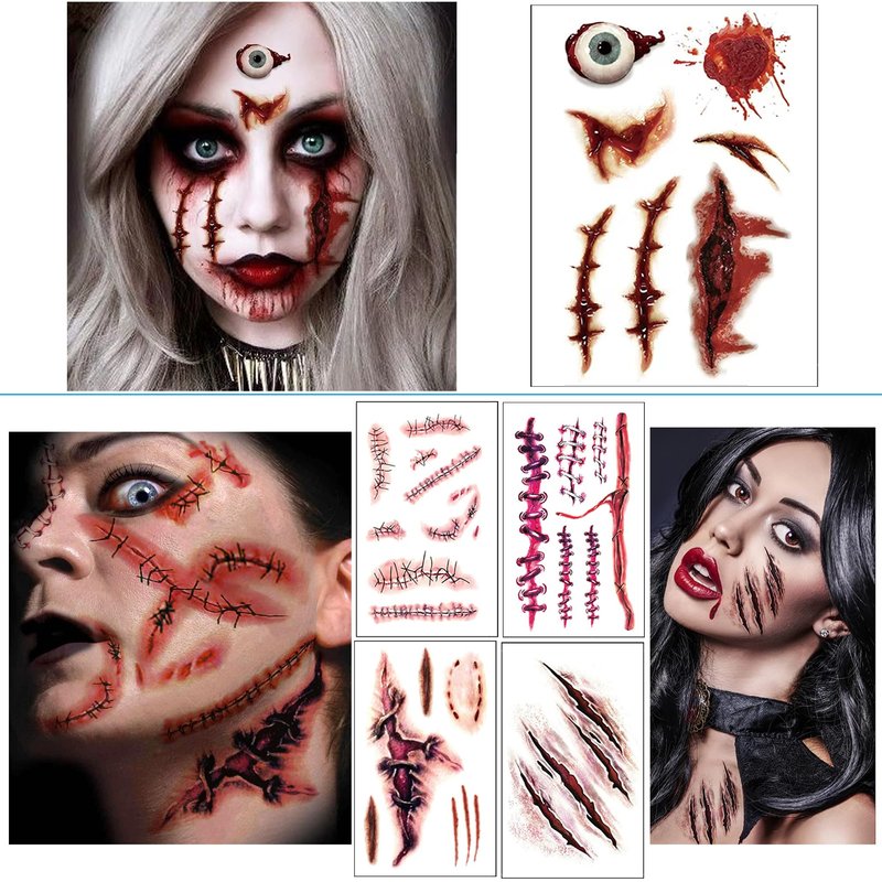 - 【26 Sheets Fake Scars Tattoos Temporary Halloween】--3D Horror Halloween Temporary Tattoos For Women Men Adults Body Art Stickers Look Real! These temporary tattoos will meet your requests well. Realistic Wound Temporary Tattoos For Adults Women Halloween Zombie Makeup Kit , Chucky Makeup Kit, Scary Bite Mark Cut Blood Vampire Halloween Scars Tattoo Stitches Injury Bloody Scratches Scab Set.