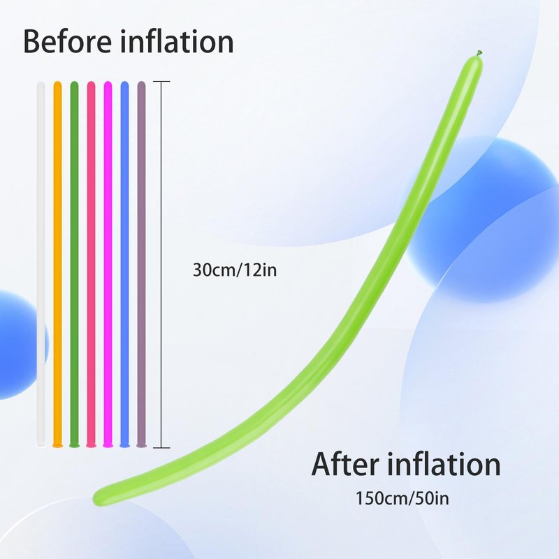 - PURCHASE REMINDER: Our long 260 balloons measure 12 inches long. Will expand to between 50 inches long when inflated. Please don't pump up fully. Please do not inflate the balloon more than 90%, or rub it against overheated and sharp objects to avoid sudden popping.