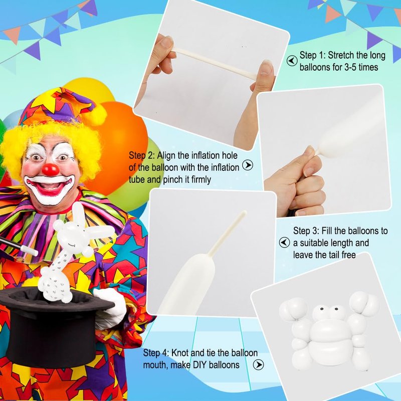 - 💡LET'S DIY ODDLY SHAPED BALLOONS: You can twist and combine the long balloons to create popular balloon shapes for kids, such as puppies, rabbits, spiders, swans, flowers, lollipops, cars, rainbows, hats, long swords, airplanes, animated characters and so on. You can do the balloon creation with your kids and enjoy the DIY time with them, which can improve their hands-on ability and creativity.