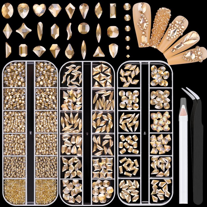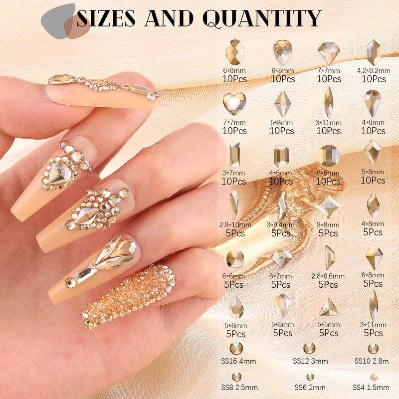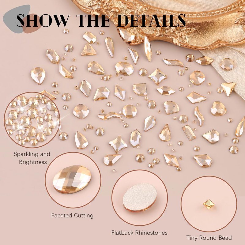 - 💎PACKAGE CONTENT -- The package contains 240Pcs multi shapes flatback gems crystal and 2510Pcs 1.5-4mm round beads, totally 2750Pcs Champagne Gold rhinestones. Additionally, 1 tweezers for large size gems and 1 pickup pen for small size gems. This rhinestones kit makes it easy for you to make any nail art you like, and will bedazzle your acrylic nails!