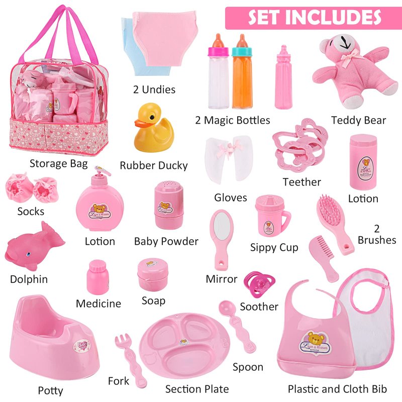 Transform your little girl into the perfect caregiver with this 28-piece baby doll accessories set! This complete baby doll accessory kit includes everything needed to create the perfect care-taking environment for her baby doll. Your child can pretend to feed her baby doll with the real-looking baby bottles, spoons, sporks, and divided dishes. She can easily keep her baby doll clean with the included easy-to-use velcro closure bib. The doll set is ideal for teaching children about nurturing skills and developing their cognitive skills. Little mommies can teach their doll the right skills for potty training with the included diapers and training potty, making learning fun! The toy accessories are made from non-toxic, BPA-free plastic. The zip-close storage bag is easy for kids to use and helps make clean-up time a breeze. Pretend imaginative play sets can help develop children's cognitive skills, and our baby doll sets will help spark hours of magic and fun for your little one. Perfect for kids ages 3 and up, this set is a must-have for your child's toy collection.